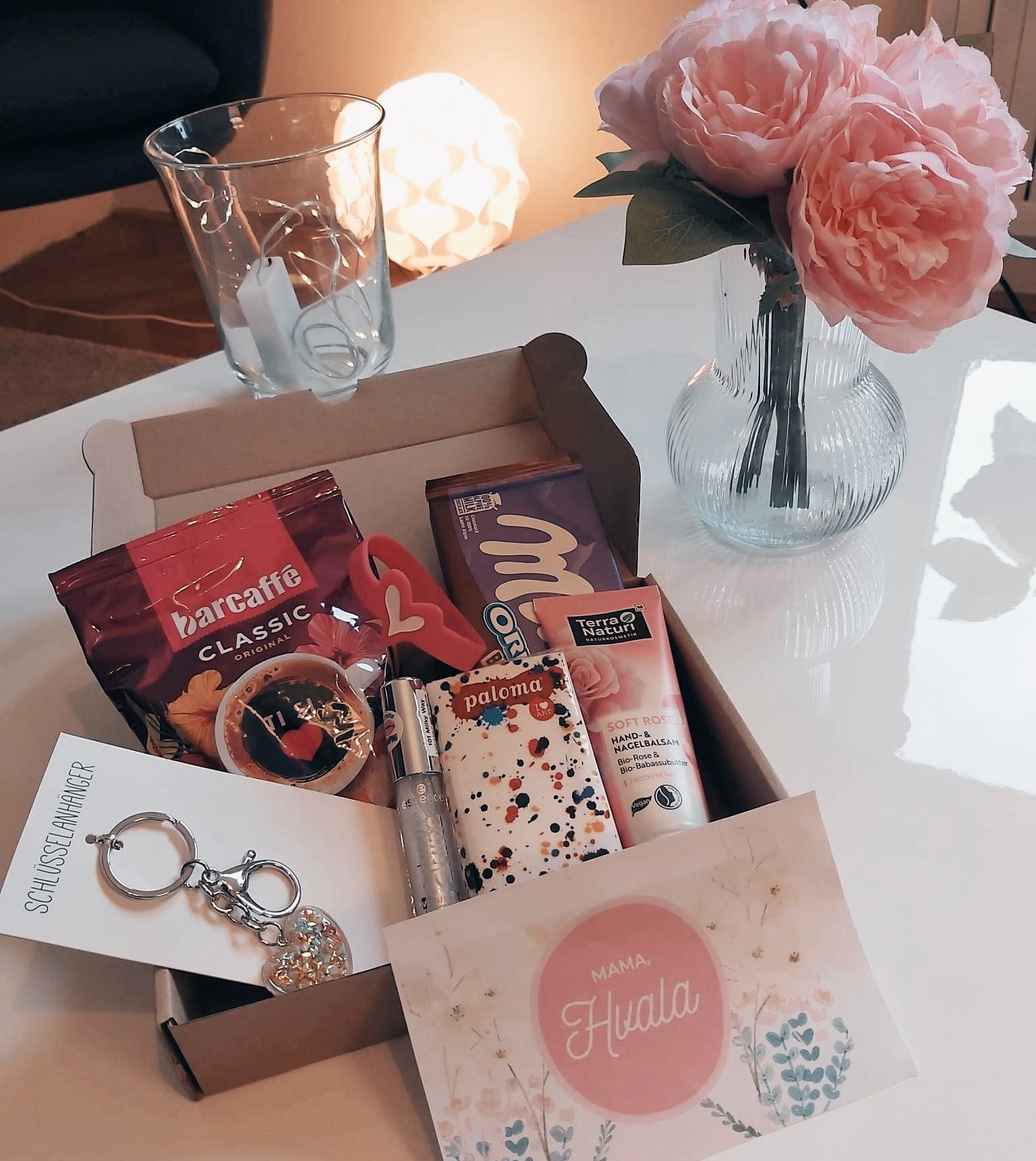 Paket, ki smo ga pripravili in lahko z njim razveselite svojo obdarovanko, vsebuje čokolado, kavo, kremo za roke, glos za ustnice, obesek za ključe, robčke in zapestnico z napisom "Mama, hvala za življenje".